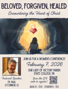The women’s conference begins with 9:00AM Mass. It features two talks by Father Paul O’Connor, SJ as well as opportunities for Adoration, Confession, and Prayer. The event concludes at 4:00PM. Registration is $30 for adults and $15 for college students. Fee includes a light breakfast as well as lunch.